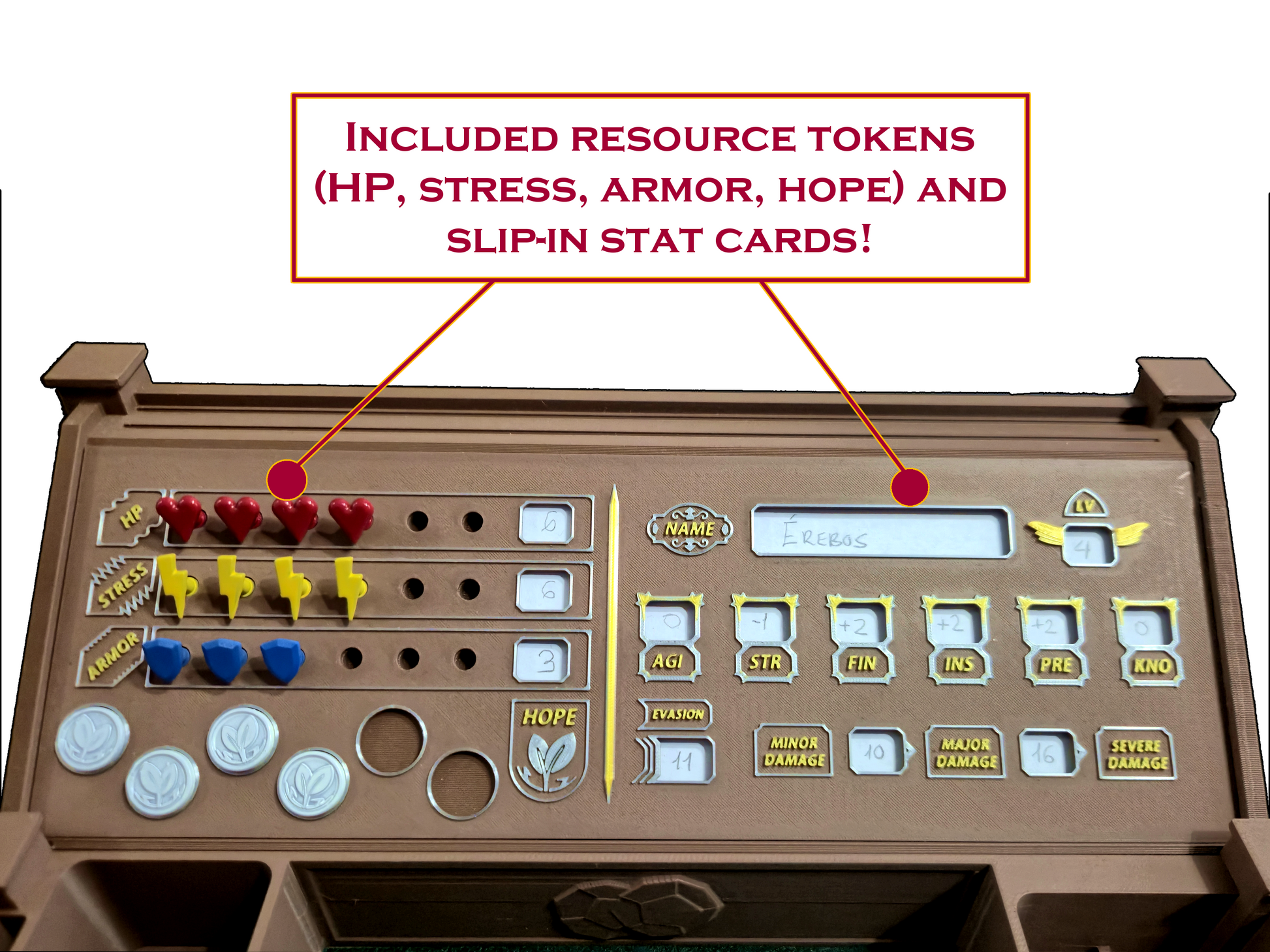 Resource Tokens – Six slots for HP, Armor, Stress, and Hope. Supports single or double tokens for up to 12 points.