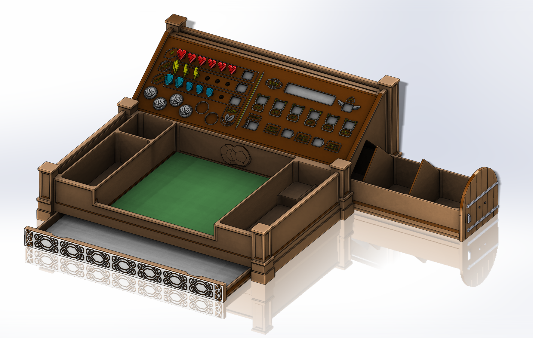 - A lateral drawer with customizable dividers to store tokens, dice, pencils, or accessories—great for packing up between sessions.